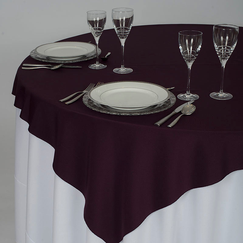An eggplant purple polyester overlay is a rich and luxurious fabric that brings depth and sophistication to any setting. The deep, muted purple hue of eggplant evokes a sense of elegance and opulence, making it an ideal choice for formal events, weddings, and upscale gatherings. Its dark, almost regal colour pairs beautifully with both light and dark tones, adding a dramatic flair without being overwhelming.