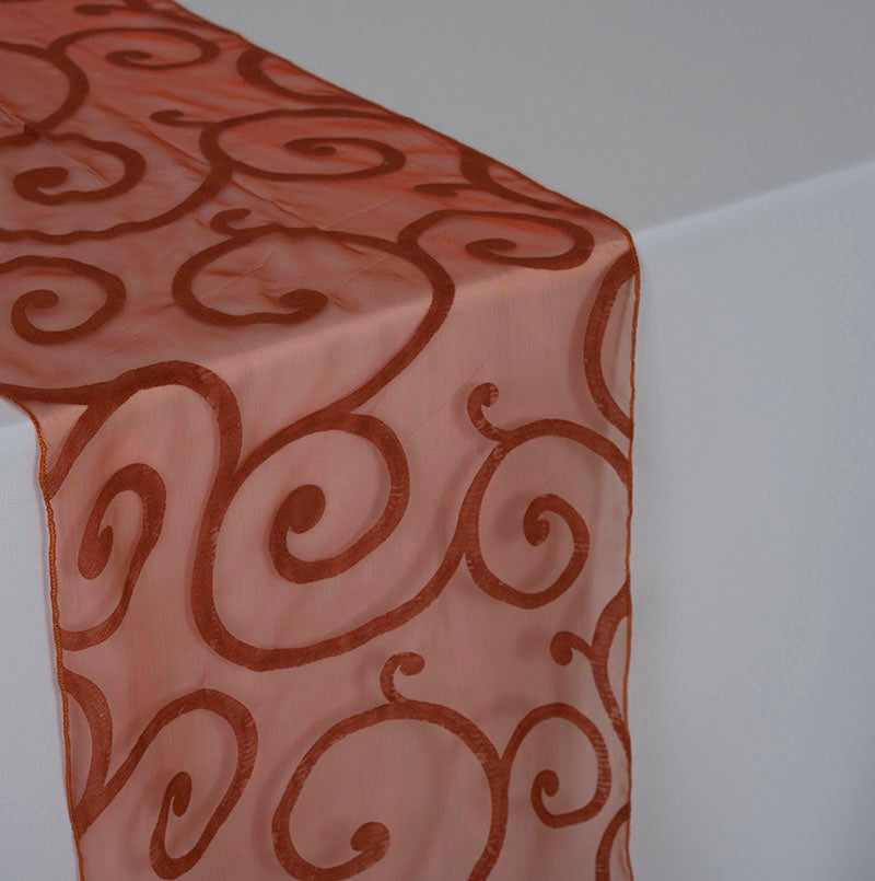 Whether used alone for a contemporary and warm look or paired with complementary table linens for a coordinated style, the Rust Swirl Sheer Table Runner adds a touch of elegance and visual interest to the dining experience.