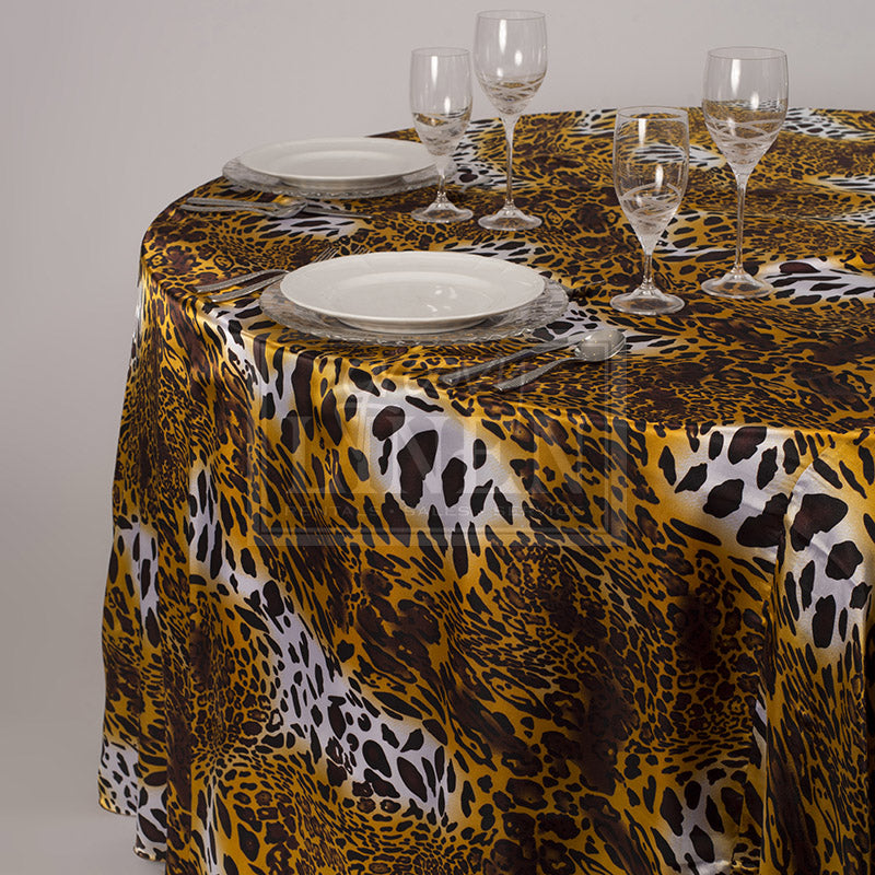 A Leopard Satin tablecloth is a luxurious and bold piece of decor that adds an exotic, sophisticated flair to any setting. The tablecloth features a striking leopard print pattern, with its signature blend of warm golden tones, dark browns, and subtle blacks, creating an eye-catching contrast. This design, combined with the smooth, glossy finish of satin, makes it a perfect choice for events that require a touch of glamour, such as upscale parties, galas, and themed celebrations.