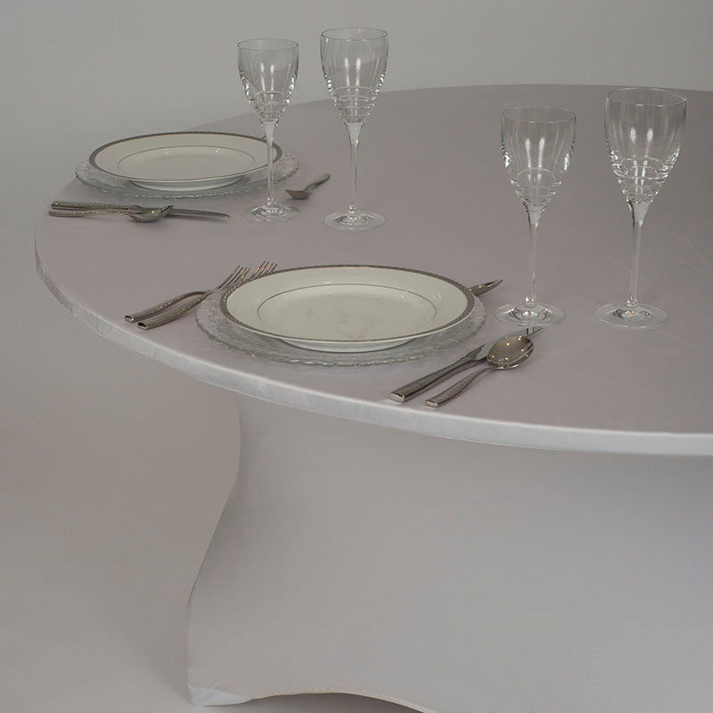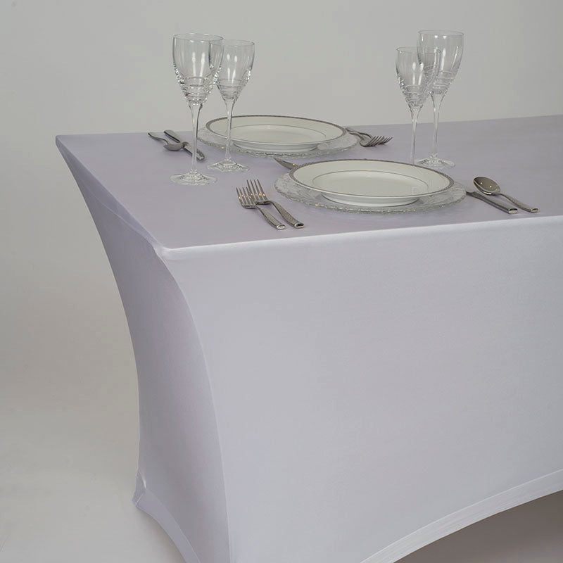 A spandex white table cover is a sleek, modern fabric designed to give tables a smooth, fitted, and elegant appearance. Made from a stretchy, form-fitting spandex material, it hugs the shape of the table for a clean, polished look that doesn’t wrinkle or sag, creating a crisp, uniform surface.